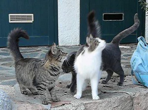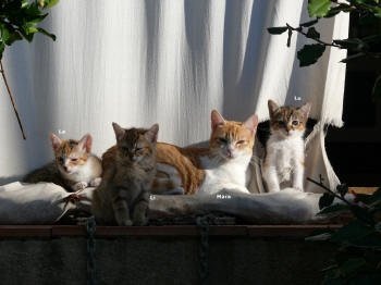 Im Dezember wurden wir auf diese kleine Familie aufmerksam gemacht. Mutterkatze Mara mit ihren eigenen 3 Kleinen hatte Luna und Udo mit in ihre Familie aufgenommen und lebt mit Kater Mickey gut geschützt auf einer kleinen Terrasse. Leider wird dort im Sommer wieder starker Geschäftsbetrieb herrschen und es wird sehr schwierig werden für die zutraulichen Kleinen die wenig Scheu zeigen. Zu sehr an Menschen gewöhnt haben sie auf der Straße wenig Chancen. Daher haben wir uns in diesem Fall entschieden sie in ein katzengerechtes Zuhause zu vermitteln. | ||